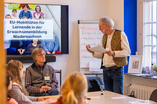 Achim Scholz mit Akteurinnen und Akteuren der Niedersächsischen Selbsthilfegruppen gemeinsam mit Fachkolleginnen für Erasmus+ der Nationalen Agentur Bildung für Europa. Dieser Workshop bot die Gelegenheit, von den Erfahrungen der Lernenden und des Bildungspersonals einer Erasmus+ Mobilität nach Wien zu hören. Gemeinsam berichteten sie von den Chancen und Herausforderungen bei der Planung und Durchführung. Im Zentrum standen die Gelingensbedingungen für eine erfolgreiche Mobilität sowie die Schwierigkeiten, die überwunden werden mussten. Dabei wird der Leitsatz „Nichts über uns ohne uns“ konsequent berücksichtigt – Lernende und Bildungspersonal teilten ihre Perspektiven und Erfahrungen gleichwertig.