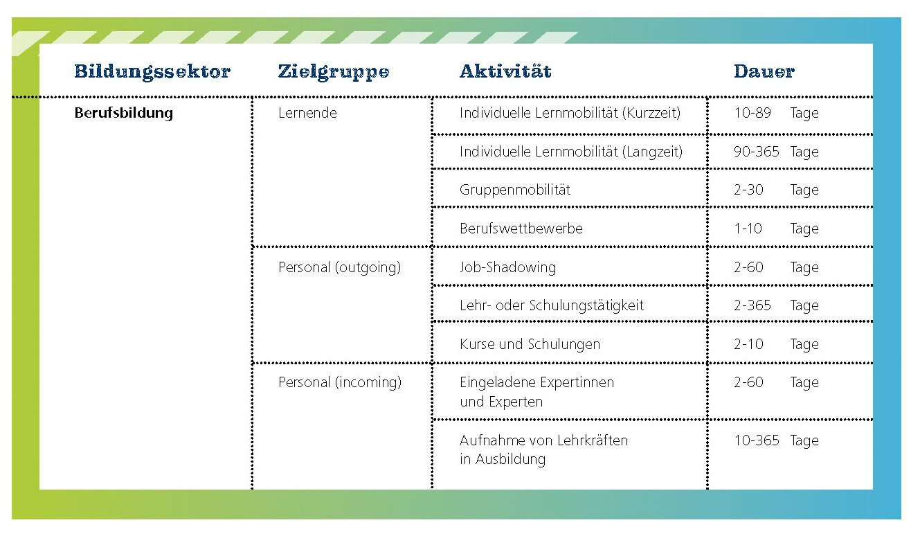 Lernaufenthalte für Einzelpersonen und Gruppen, Job-Shadowings, Lehr- und Schulungstätigkeiten, Kurse, Berufswettbewerbe, „Eingeladene Expertinnen/Experten“, Aufnahme von Lehrkräften in Ausbildung