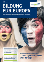 Unser Journal „Bildung für Europa“ erscheint zweimal jährlich kostenlos. Es informiert Sie zu ausgewählten Schwerpunktthemen über die aktuellen Entwicklungen im EU-Programm Erasmus+ und in der europäischen Bildungszusammenarbeit.